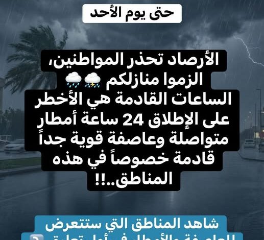 حذّرت هيئة الأرصاد الجوية المواطنين من موجة طقس شديدة تضر,ب البلاد بداية من اليوم وتستمر حتى يوم السبت المقبل، حيث تتعرض معظم المناطق لانخفاض حاد في درجات الحرارة يصاحبه نشاط قوي للرياح وأمطار متفاوتة الشدة قد تصل إلى حد الغزارة في بعض المناطق، ما يرفع من احتمالات تشكل السيول واضط,راب حركة الملاحة والمرور.