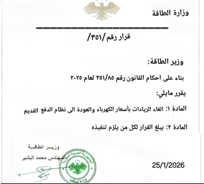 تداولت حسابات على مواقع التواصل الاجتماعي، خلال الفترة الماضية صورة قيل إنها لبيان صادر عن وزارة الطاقة السورية، يتضمن إلغاء الزيادات الأخيرة على أسعار الكهرباء والعودة إلى نظام الدفع السابق.