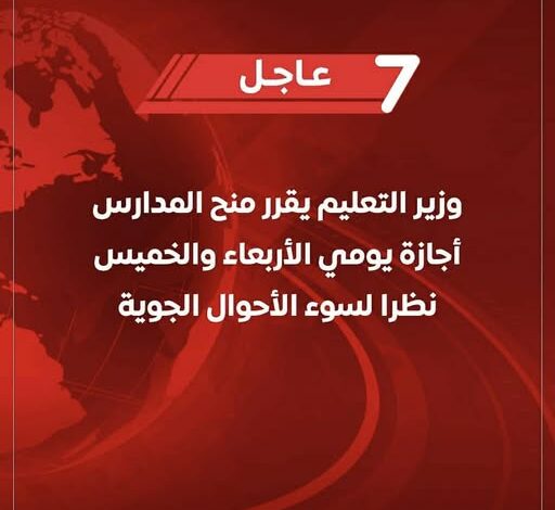وزير التربية والتعليم يقرر منح المدارس أجازة يومي الأربعاء والخميس المقبلين