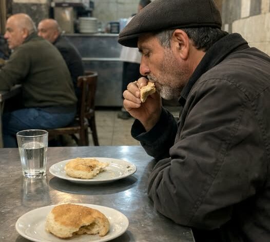 دخل رجل غريب الى مطعم في الشام في مدينة دمشق وطلب رغيف خبز اكل نصفه وترك النصف الأخر وخرج وفي كل يوم كان يفعل ذلك فانتبه اليه رجل من أهل الشام فسأله بكل ادب بعد السلام
