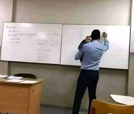 دخل عميد الكلية ومعاه إشراف من الوزارة وناس مهمين بالنسبه لتطوير الجامعه المحاضرة خبط العميد ودخل . كان زياد واقف بيشرح والبيبي نايم علي كتفه