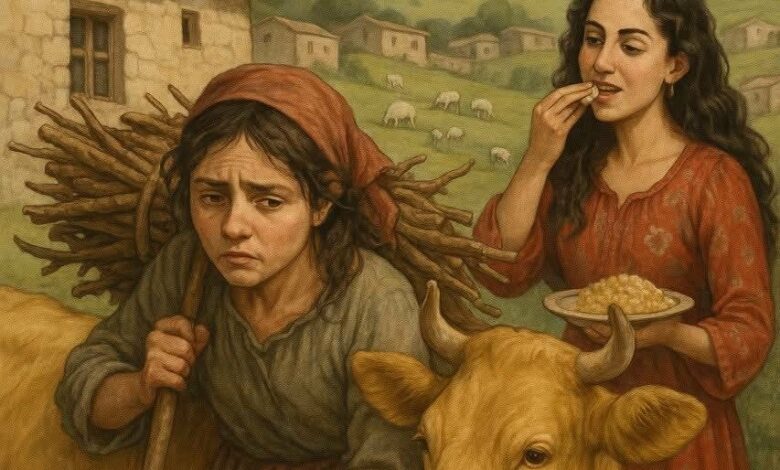 المرأة الفتاتين لرعي الحيوانات فكانت تضع في جراب ابنتها ما لذ و ما طاب من الأكل ما فاتو فكانت تضع لها رغيف خبز يابس و وبصلة أما في الدار فكانت كل الأعمال المتعبة تقع على عاتق فاتو أما كل ما هو سهل تقوم به عيشو ولما تجلسان تعطيي المرأة لابنتها كرة صوف صغيرة لتغزلها أما فاتو فيكون نصيبها كرة صوف كبيرة وحين تذهب أختها للنوم تبقى المسكينة تغزل ولا تنام إلا بعد أن تنتهي من الغزل .ولم تكن البنت تشتكي لأبيها لأنه لا يصدقها فهي تعلم أن زوجته تسحره فيطيعها في كل شيئ ولا يرفض لها طلبا .و مع مرور الأيام كانت عيشو تزيد غنجا و دلالا و كان وجهها يشع نورا من كثرة جمالها .. أما فاتو فيوما بعد يوم كانت تفقد جمالها الخلاب و سحرها من