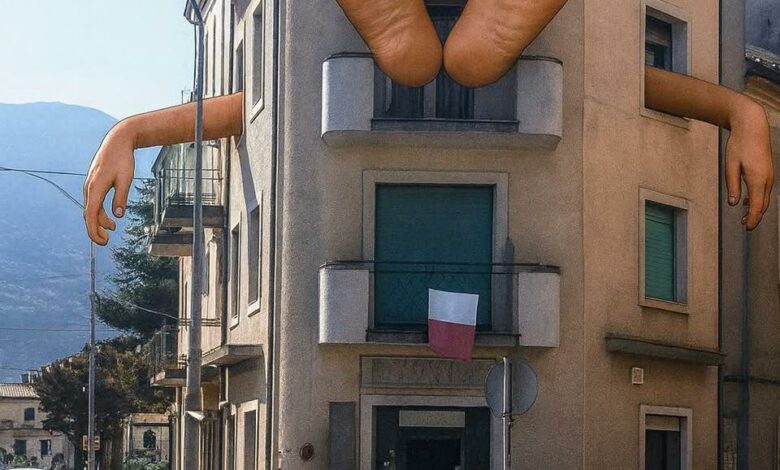 الصورة تُظهر الزوج وهو يتدلى بأقدامه وأذرعه من نوافذ المنزل، وكأنه عملاق خرج لتوه من سبات عميق أو يمارس رياضة بهلوانية بعد عقود من القيد. هذا بالضبط ما يحدث على الصعيد النفسي.