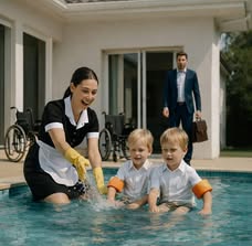 الرجل الذي تحكم في أدق تفاصيل حياته أدرك أخيرا الشيء الوحيد الذي حاول منعه أكثر مما ينبغي لف ذراعيه حول الطفلين بحذر ووعي بالكرسيين وبكى علنا قرب المسبح