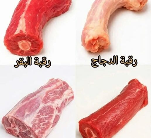 تُظهر الصورة أربعة أنواع مختلفة من الرقاب الحيوانية التي تُستخدم في المطبخ العربي والعالمي: **رقبة البقر**، **رقبة الدجاج**، **رقبة الغنم**، و**رقبة الإبل**. على الرغم من أن هذه الأجزاء قد لا تكون الأكثر شهرة مثل شرائح اللحم أو صدور الدجاج، إلا أنها تحمل قيمة غذائية عالية وفوائد صحية جمة، كما أنها تُعد كنوزًا في عالم الطهي لما تمنحه من نكهة عميقة وقوام غني للأطباق، خاصة عند استخدامها في الحساء والمرق.