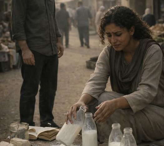 بعد هذه الحاډثة بإسبوع تم طردي من المحاضرة الأستاذ لم يتحمل قدومي متأخرة كل يوم ووصفني بعدم الجدية طبعا لم أشأ إخباره أن الفقر هو السبب خرجت من المحاضرة باكية وقررت أن أترك الجامعة بلا عودة فعبد الفتاح له الحق فقدري أن أكون بائعة لبن !!! وفي اليوم التالي كنت جالسة في السوق وأنا مشغولة برصف الزجاجات والجبن فجأة وقف قدامي رجل وطلب مني سلة من الجبن البلدي ولما رفعت رأسي وجدت ذلك الأستاذ البغيض الذي طردني يقف أمام وجهي ولما رآني صاح بدهشة هي أنت تلك الطالبة التي تتأخر عن الدرس حاولت إخفاء رأسي بوشاحي فقد كان موقفا محرجا لكنه قال ليس في العمل ما يخجل وأنا آسف جدا عن ما حصلأرجو أن تقبلي إعتذاري لا بأس في التأخر قليلا وسأعطيك نسخة من أوراقي و راجعيها لما تعودين إلى المنزل ثم أخرج من محفظته ورقة مالية من فئة كبيرة ولما هممت بارجاع الباقي وجدته قد إنصرف ومن بعيد وقف ثم رفع لي يده .